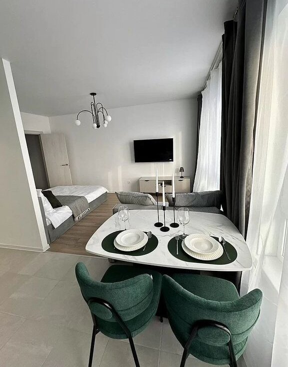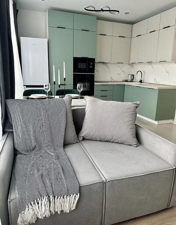 Установлена сплит-система, предусмотрена уютная ТВ-зона, мягкий раскладывающийся диван с полноценным спальным местом, большой обеденный стол. Имеется вся необходимая техника - индукционная плита, духовой шкаф, микроволновая печь, посудомоечная машина, холодильник.