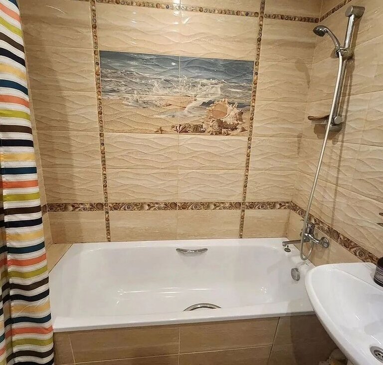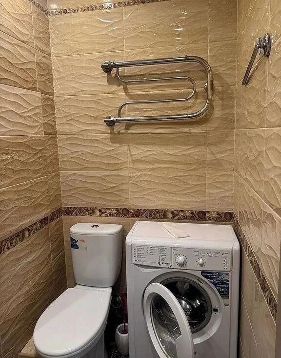 Санузел совмещенный, оформлен в современном стиле с качественной отделкой. Установлены ванна и стиральная машина.
