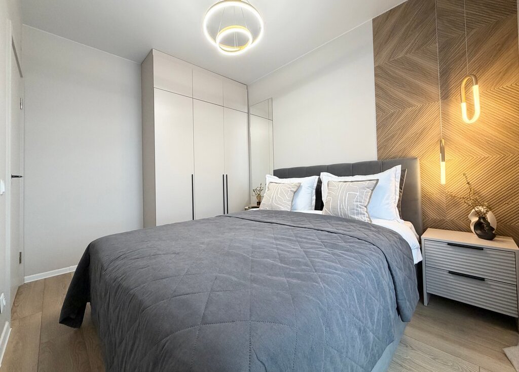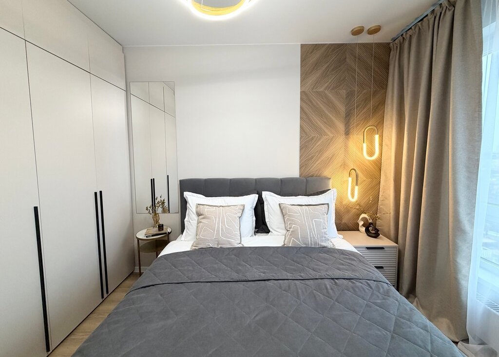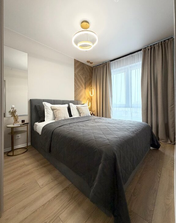 Спальня 9 кв м: двуспальная кровать с ортопедическим матрасом, прикроватная тумбочка, функциональный трехстворчатый шкаф, зеркало.