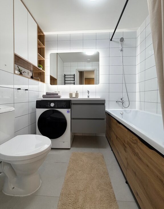 Совмещённый санузел. Ванная: ванна, шкаф навесной, стиральная машина Weissgauff, полотенцесушитель.