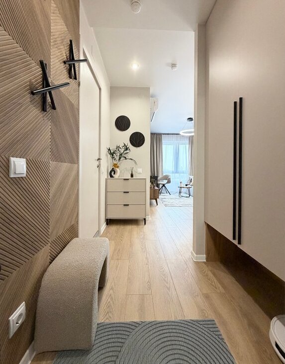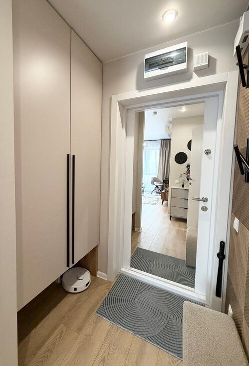 Прихожая: встроенный шкаф, комод, пуфик, робот-пылесос. Балкона нет. Метал двер с зеркалом. Закрытый тамбур. 1 пасс и 1 груз скоростные лифты. Современный подъезд с видеонаблюдением. Выход из подъезда на 2 стороны. Приличные соседи. Подземный паркинг на -2 этажа. Также возможность удобной парковки рядом с домом. Огороженная и охраняемая внутренняя территория. Двор без машин. Во дворе благоустроенная территория с детскими, спорт площадками и зонами отдыха.