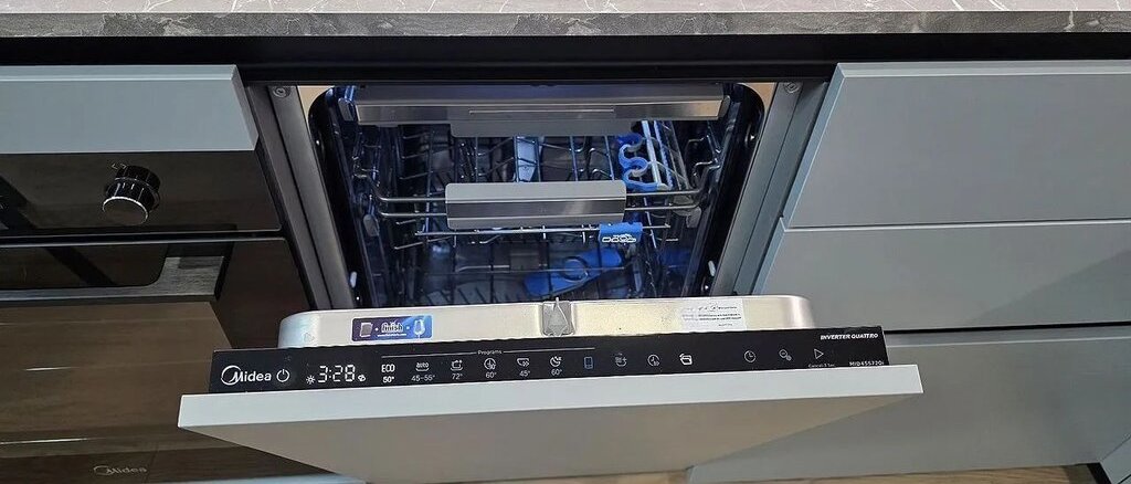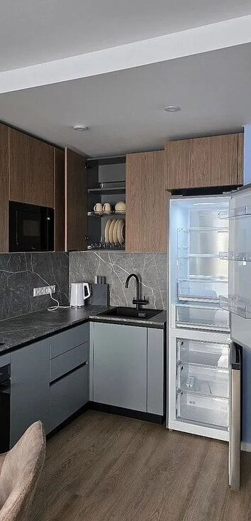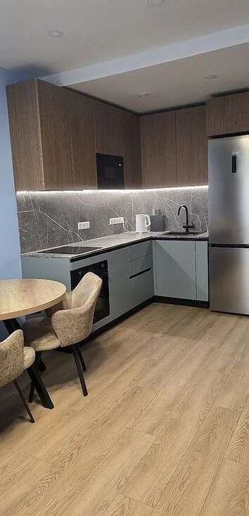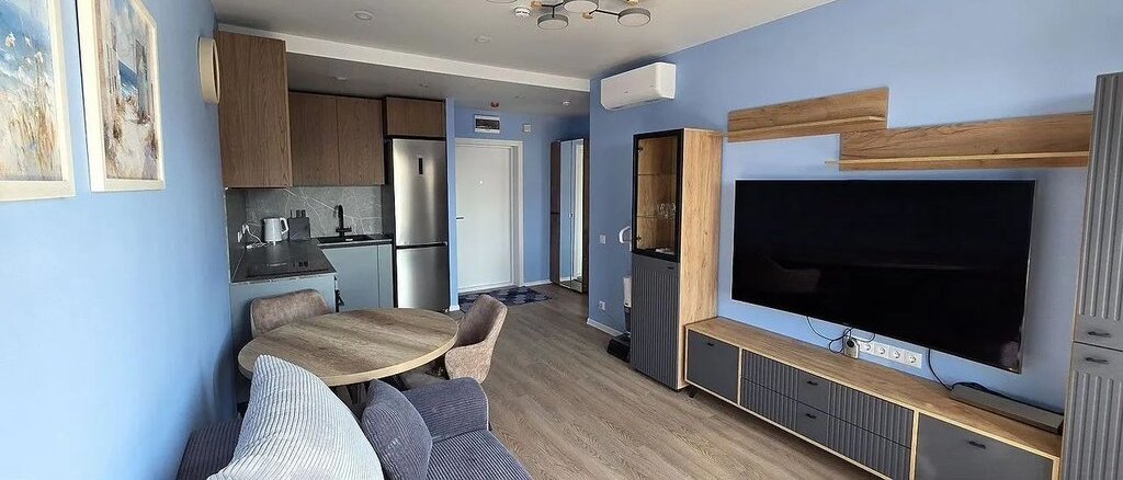 Новая бытовая техника: ПММ с управлением по wi-fi и автооткрыванием после завершения мойки, встроенная вытяжка с жестовым управлением, встроенная СВЧ-печь, фильтр для воды под мойкой, на кухне большая рабочая зона с подсветкой, телевизор в гостиной Sаmsung диагональю 65", 2 кондиционера, моющий пылесос с функцией самоочистки и сушки.