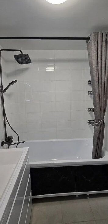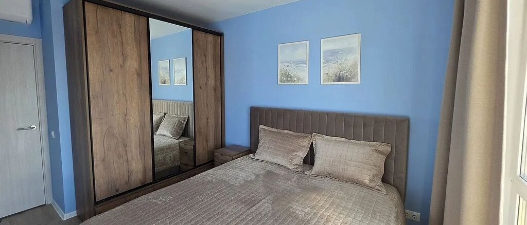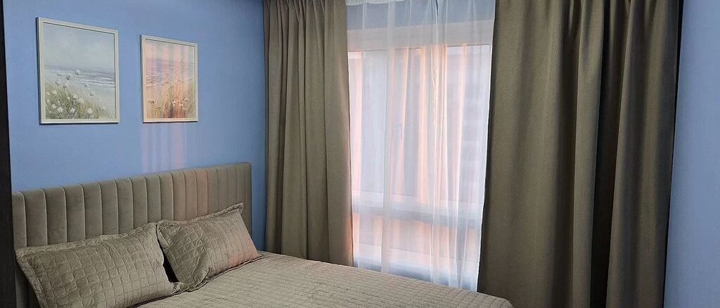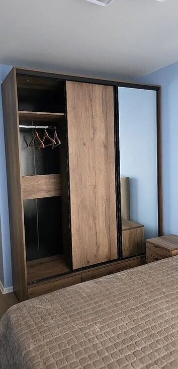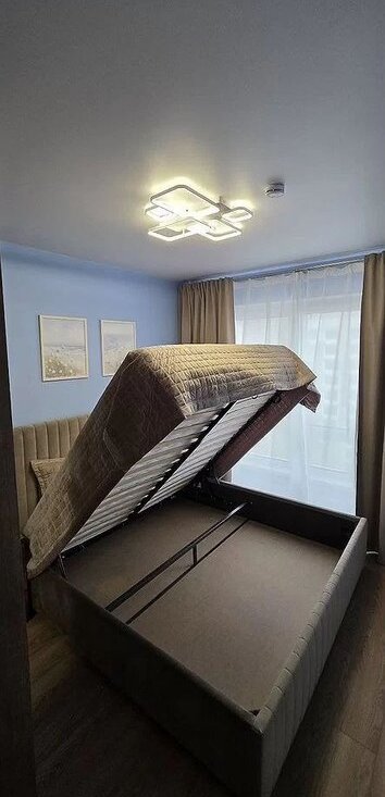 В спальне двуспальная кровать 180 см с ортопедическим матрасом и подъемным механизмом (много места для хранения), удобный шкаф с выдвижными ящиками, шторы блэкаут.