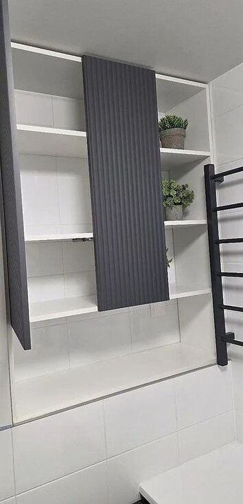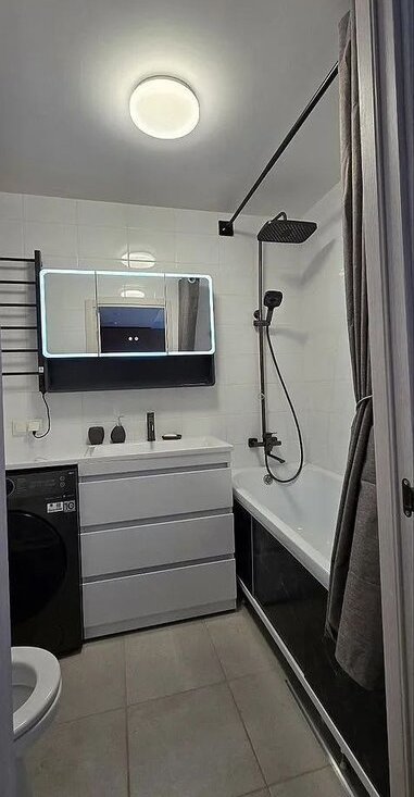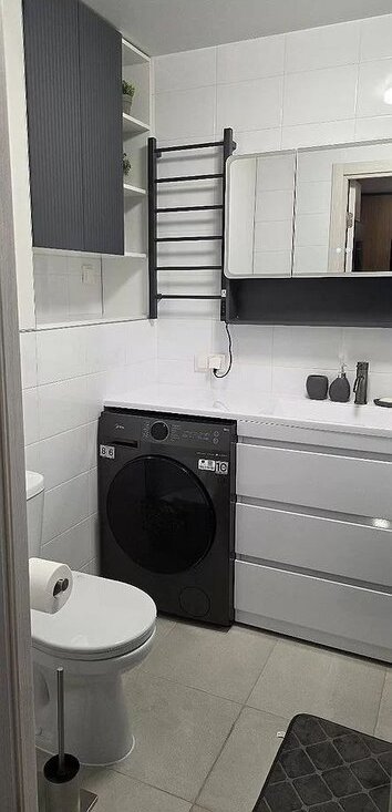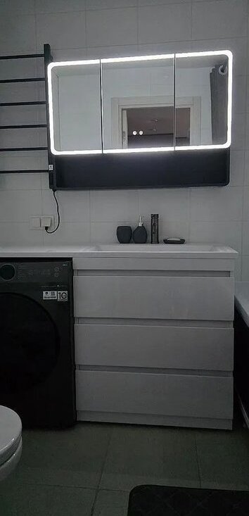В ванной комнате установлен вместительный шкаф, зеркало с подсветкой, электрический полотенцесушитель, стиральная машина с сушкой, тумба со столешницей.