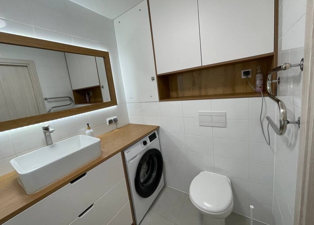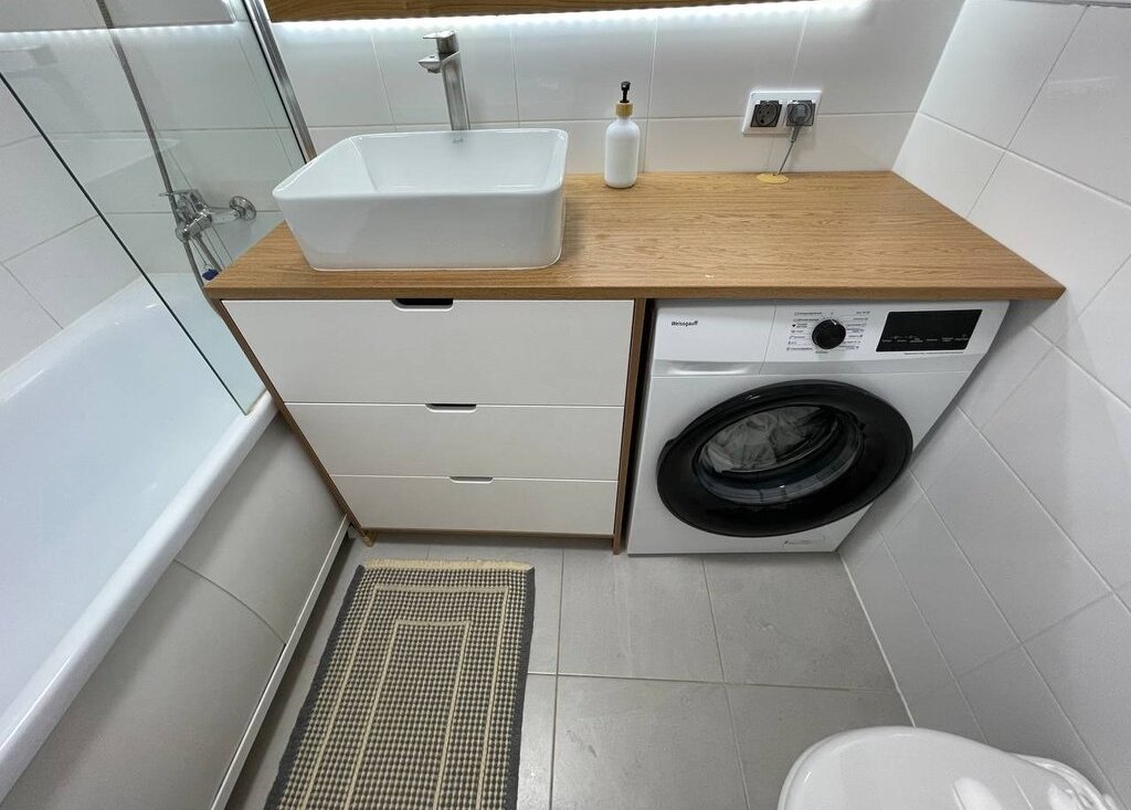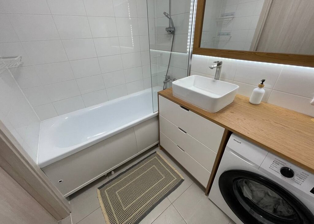 В ванной стиральная машина, экран для ванной, тумба и встроенный в нишу шкаф.