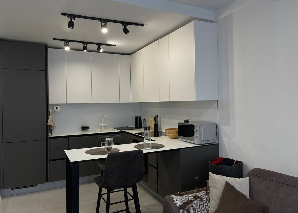 Кухня оснащена всей необходимой техникой: индукционная плита на 4 конфорки, вытяжка, духовка, посудомоечная машина, встроенный холодильник с морозилкой.