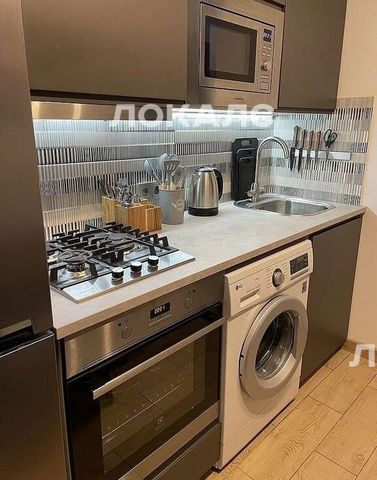 На кухне: газовая варочная панель, электрическая духовка, микроволновая печь, холодильник, стиральная машина, раскладной обеденный стол, стулья (2 раскладных, 2 обычных), электрочайник, посуда.