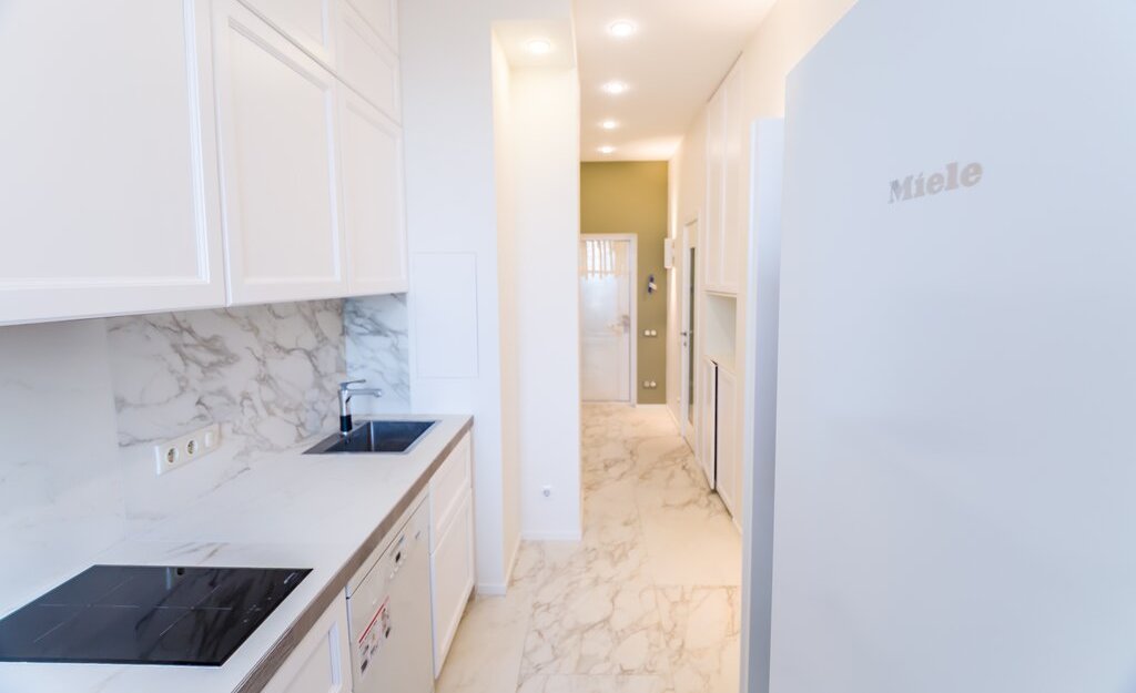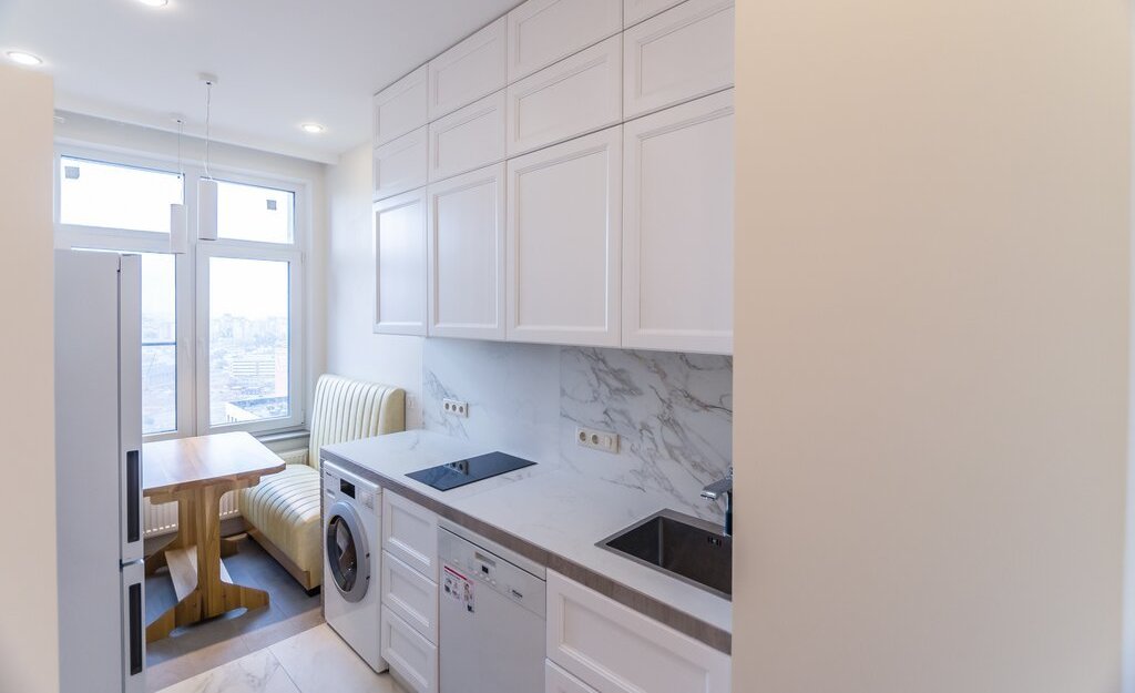 Техникой премиум класса: холодильник, стиральная и посудомоечная машины, индукционная варочная панель, кухонная вытяжка, 2 кондиционера, капсульная кофемашина, микроволновка-духовка, а так же Бризер, водонагреватель и WiFi роутер;
