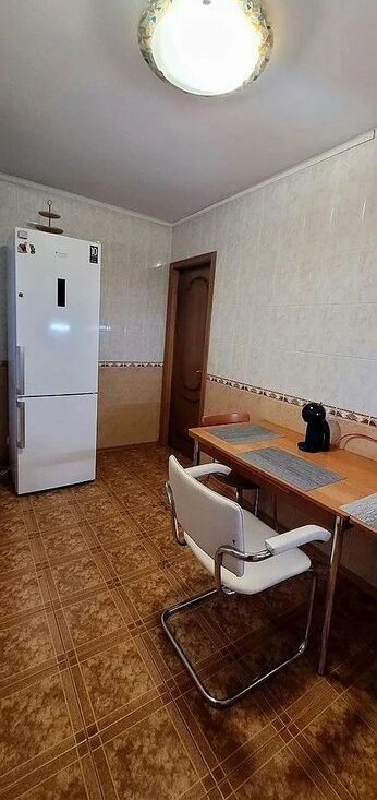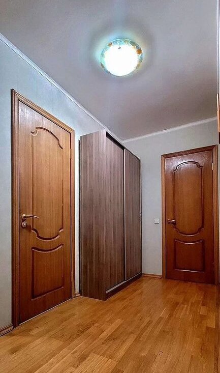 Квартира расположена на втором этаже кирпичного дома. В комнате установлен вместительный шкаф и кровать, что обеспечивает комфортное проживание. Из мебели также имеется обеденный стол и стулья.