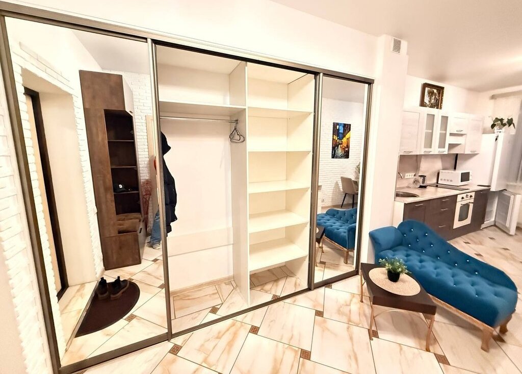 Большой, вместительный зеркальный шкаф-купе в прихожей.