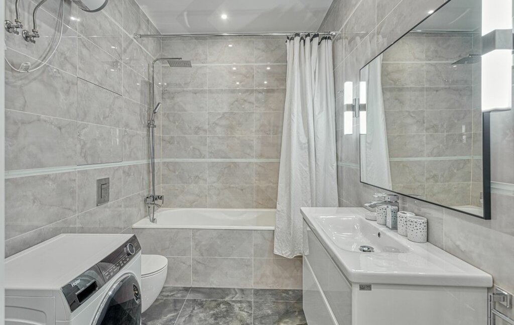 Есть посудомоечная машина, варочная панель, духовой шкаф, стиральная машина, холодильник и телевизор.