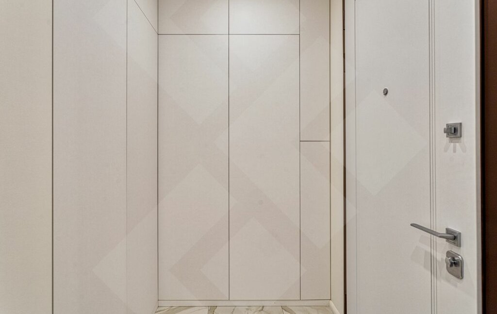 Много мест для хранения вещей. В прихожей и гостиной встроенные шкафы, глубиной 0,6 метра и кровать с системой