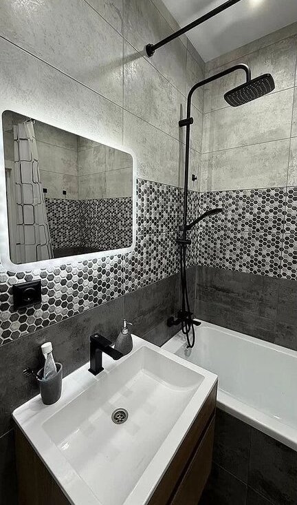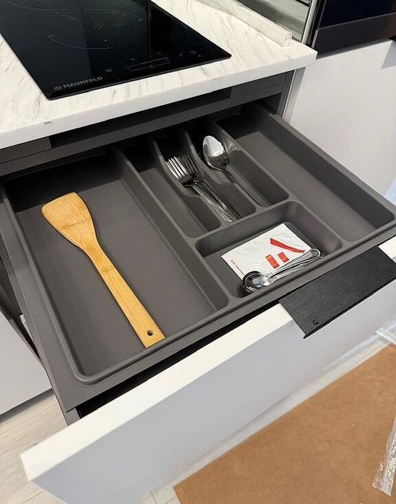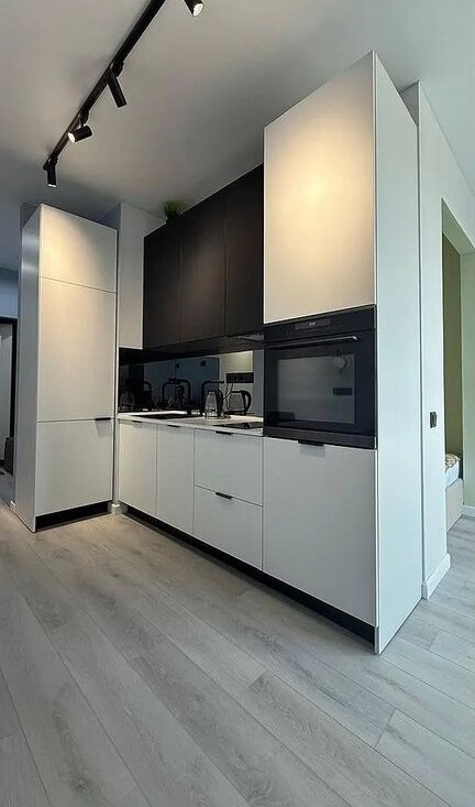 Современная кухня от качественной московской фабрики с зеркальным фартуком и полной техникой (посудомоечная машина, духовка-микроволновка, фильтр для воды).