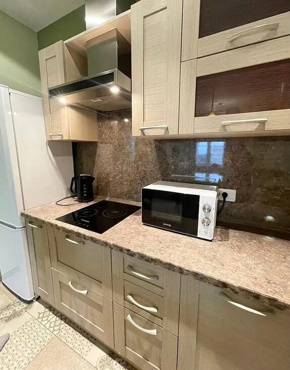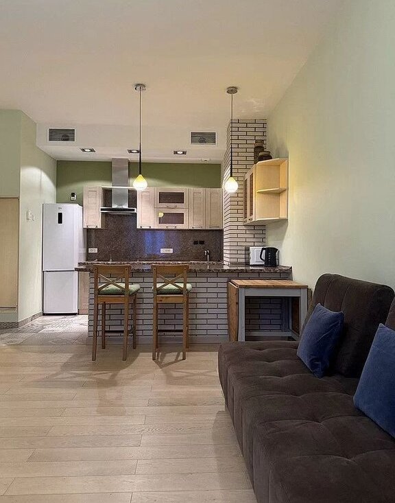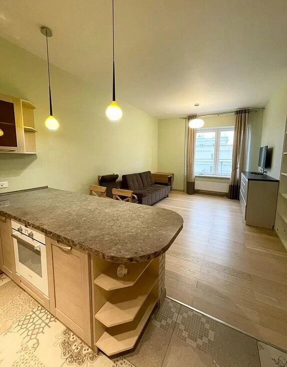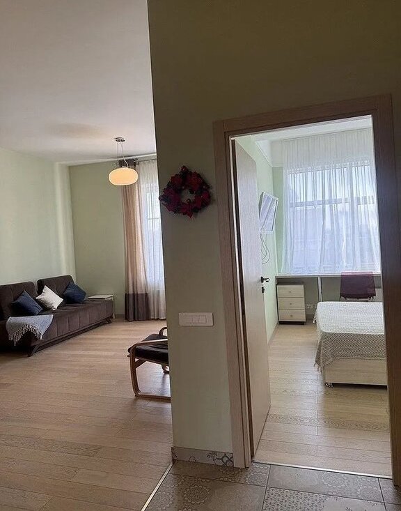Квартира с отличным ремонтом в современном стиле, высокие потолки - 3,2 м Планировка удобная: спальня, кухня-гостиная, отдельная гардеробная и санузел с душевой.
