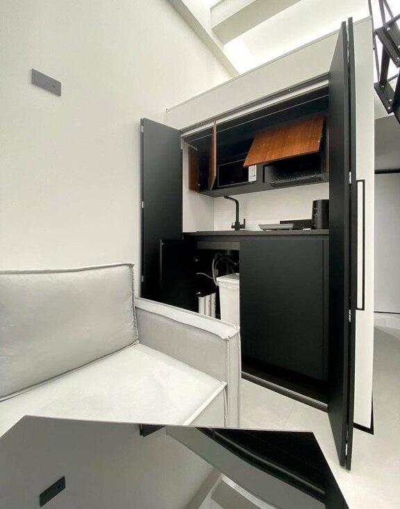 • Зону кухни закрывают раздвижные двери, что позволяет трансформировать пространство первого этажа, избегая визуального шума. Кухня компактная и функциональная - есть встроенный холодильник, вытяжка, микроволновая печь, варочная панель, чайник.