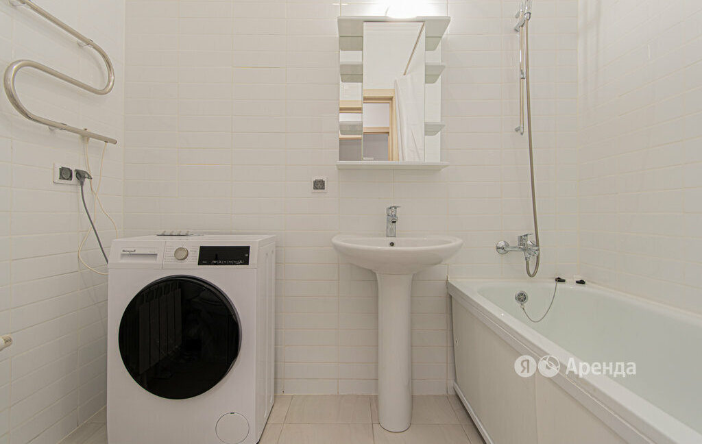 · Совмещенный санузел с ванной, раковиной, стиральной машиной, электрическим полотенцесушителем и зеркальным настенным шкафом