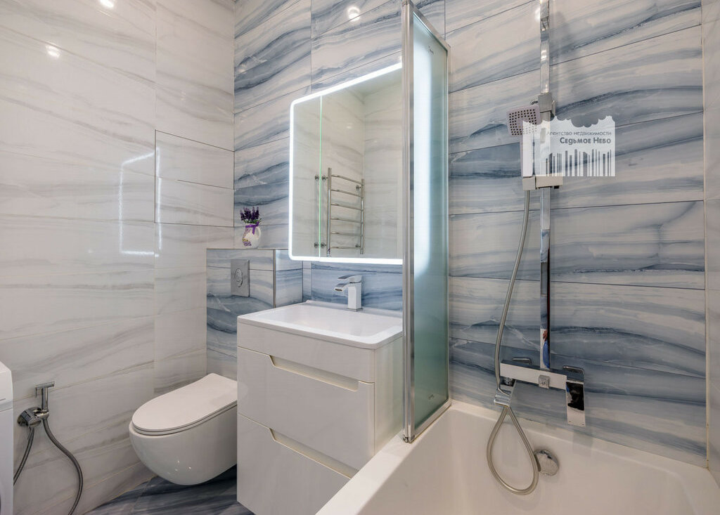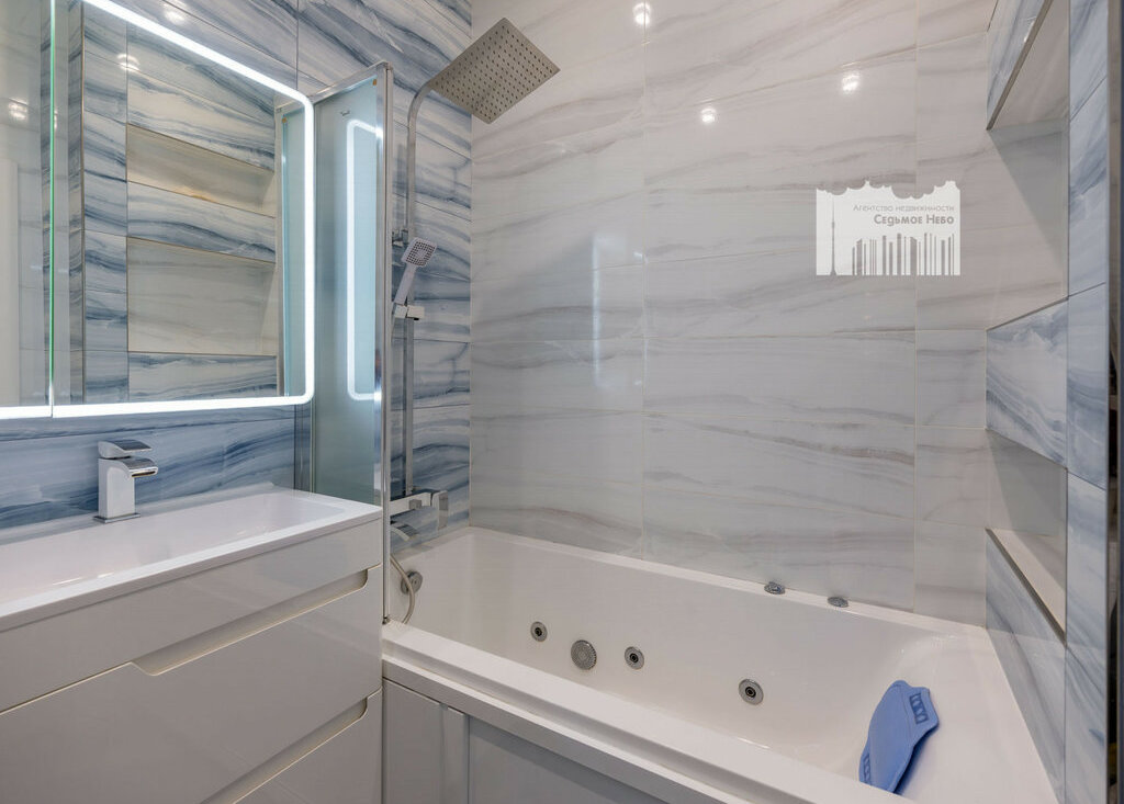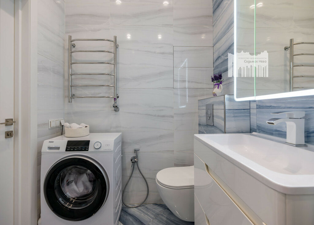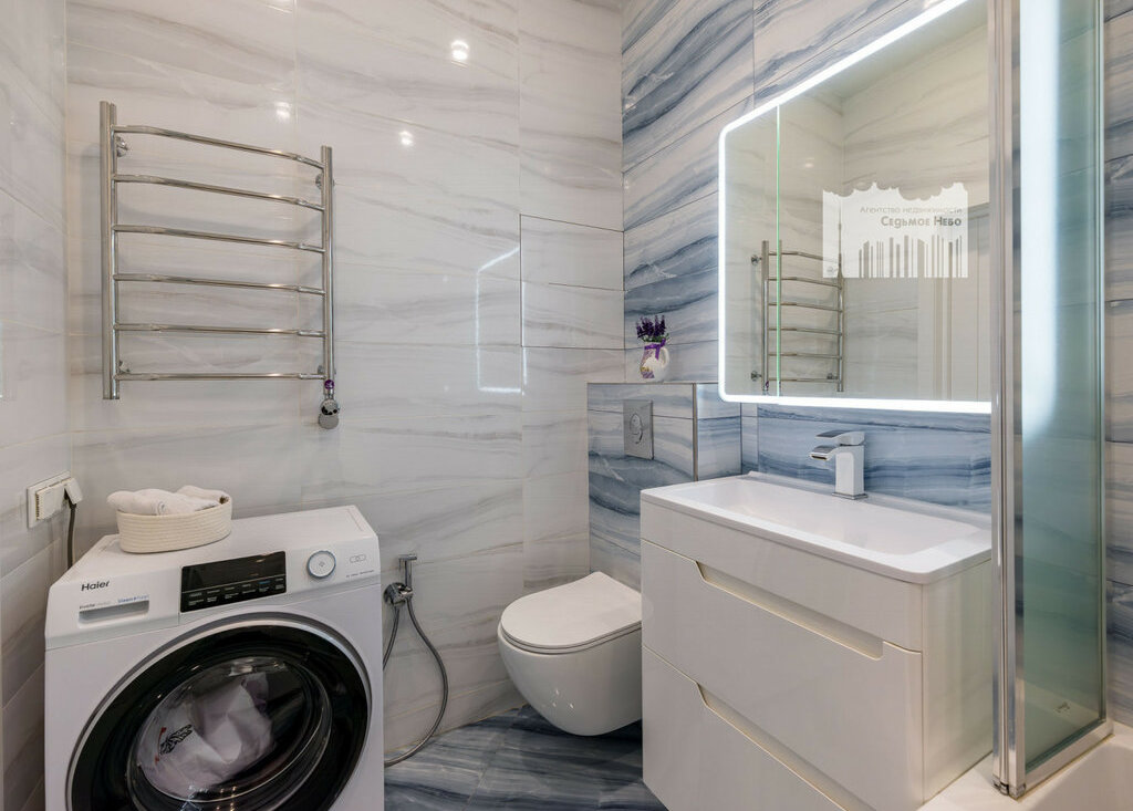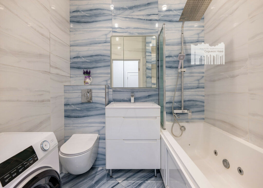 - ванная комната с ванной-джакузи и тропическим душем, стиральная машинка.