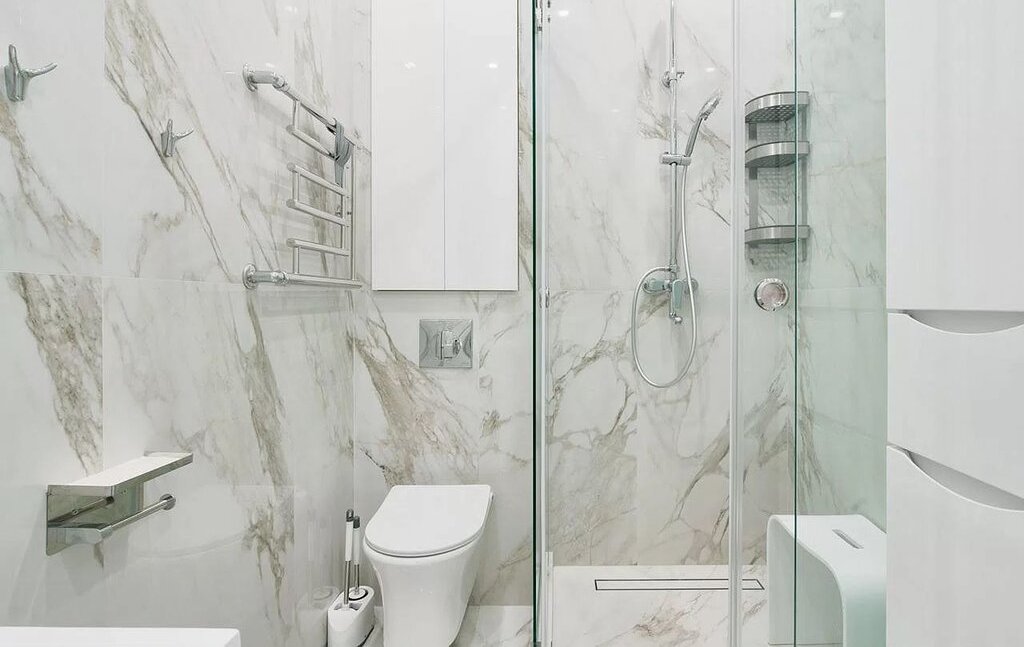 В ванной — душевая кабина с тропическим душем, зеркало с подсветкой, установлен резервный водонагреватель на время отключения горячей воды.