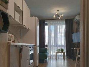 Сдаётся 1-комнатная квартира площадью 34 кв.м. с евроремонтом на 28 этаже в 33-этажном доме на срок от 11 месяцев. Из техники есть: