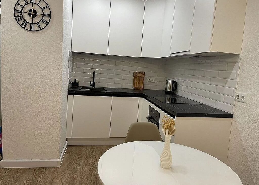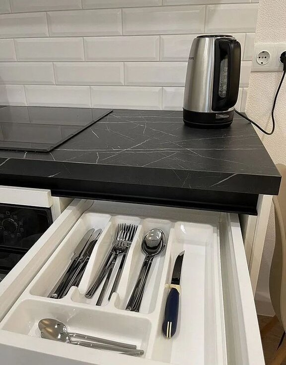 Вся мебель и техника новые, подобраны в едином стиле, в светлой и спокойной гамме.