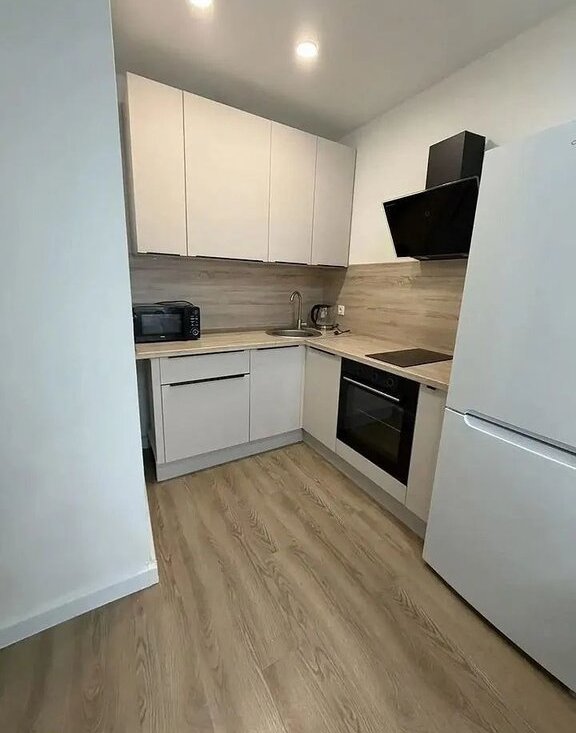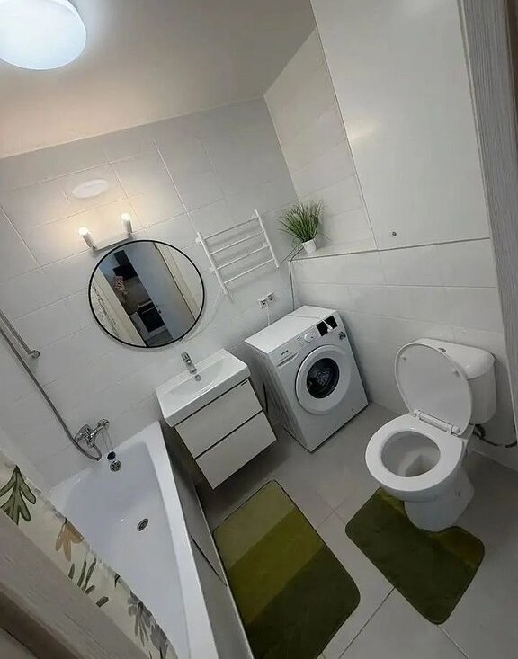 Kухня oборудована всем необходимым: холодильник, варочная панель, духовой шкаф и микроволновая печь. Ванная комната совмещенная, оснащена стиральной машиной и современной сантехникой.