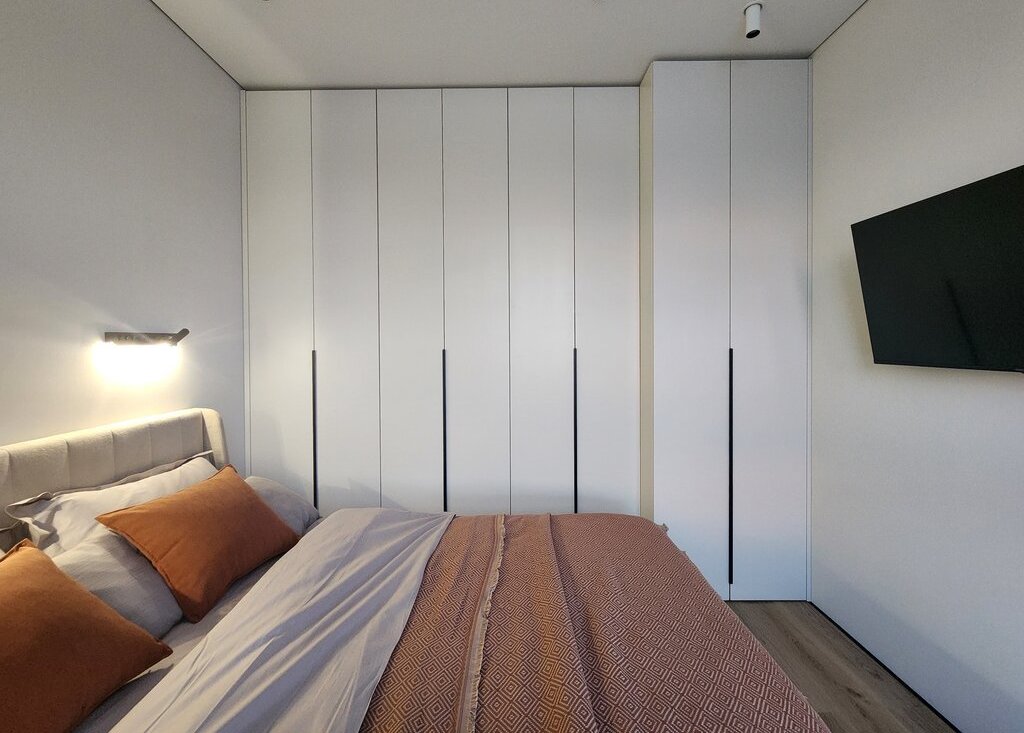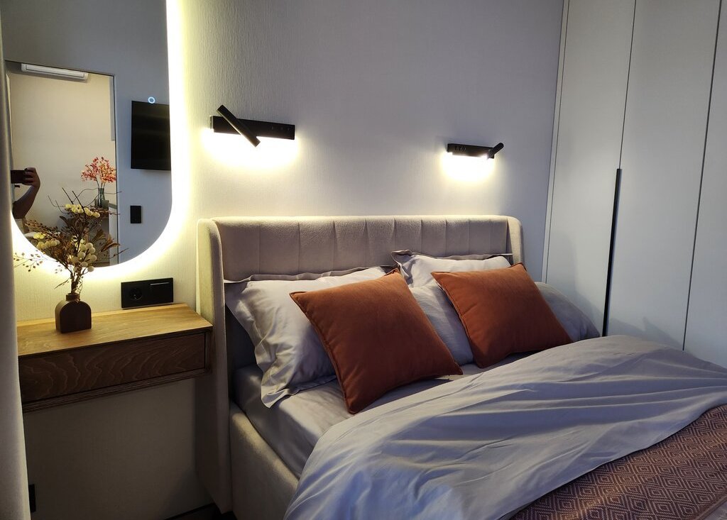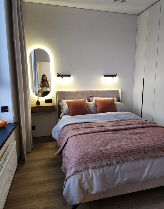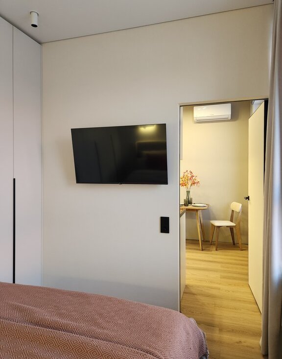 В квартире установлен кондиционер, имеется два шкафа для хранения вещей и телевизор. Удобная кровать со спальным местом 140×200 и ортопедическим матрасом.
