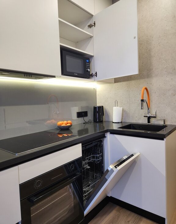 Кухня оборудована современной техникой: встроенный холодильник, индукционная плита, вытяжка, микроволновая печь и посудомоечная машина.