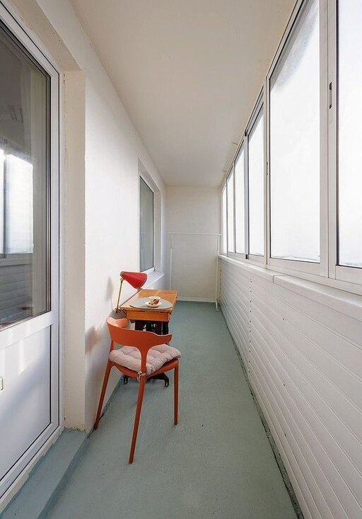 Окна кухни и комнаты выходят на просторную застеклённую лоджию.