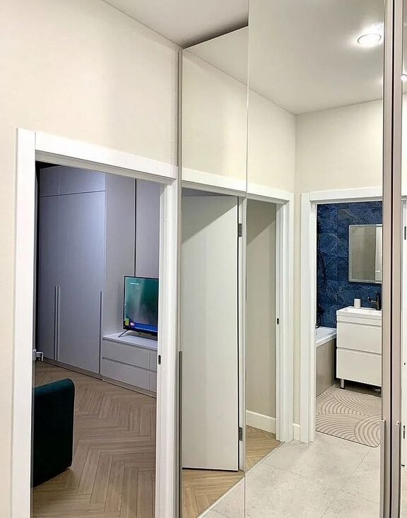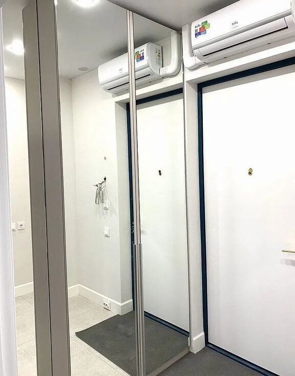 -В прихожей зеркальный шкаф для комфортного хранения вещей.
