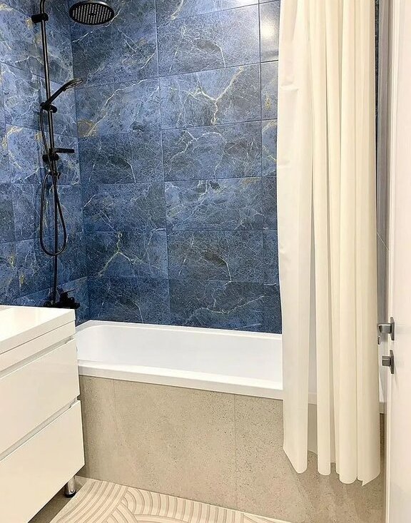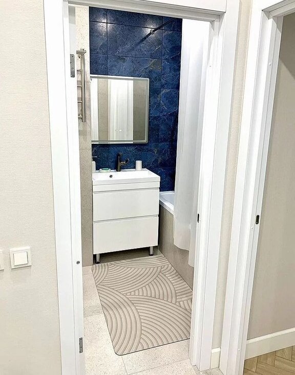 - В ванной теплый пол, стиральная машинка , электрический полотенцесушитель , полноценная ванна шириной 180 см .