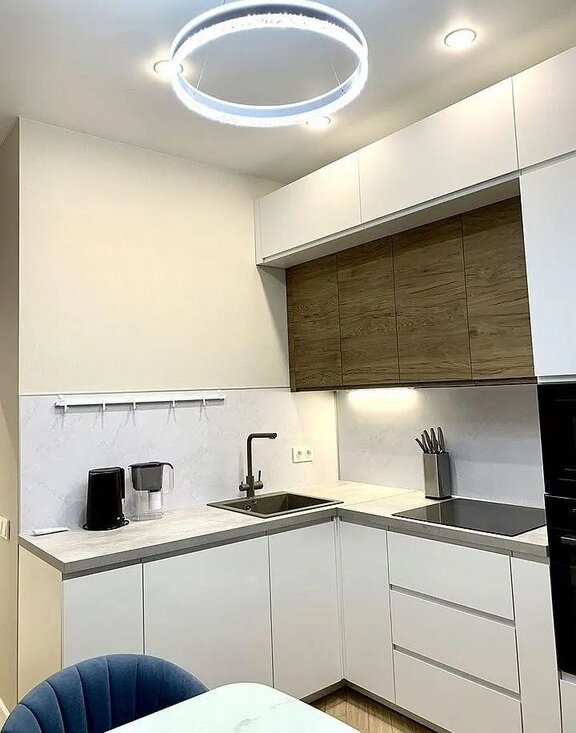 - На кухне техника : холодильник с морозильной камерой, микроволновая печь, духовка, индукционная варочная панель, посудомойка (ширина 60) , потолочная вытяжка ; вся необходимая посуда с бокалами и приборами. раздвижной стол.