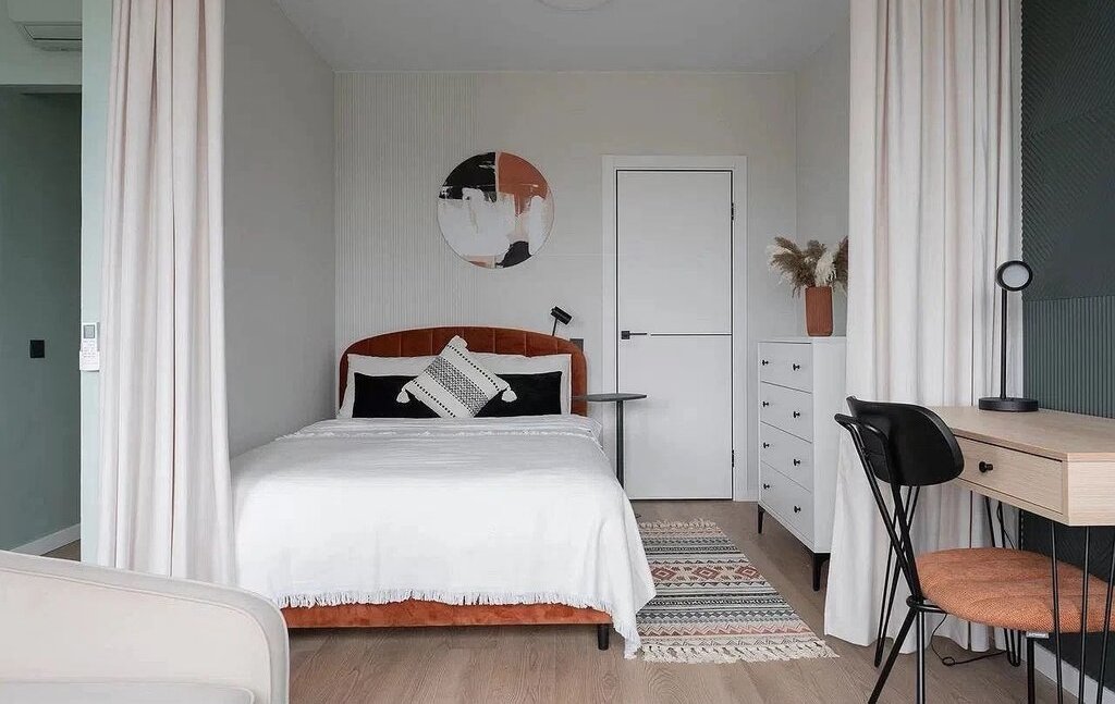 Зона кровати имеет дополнительные шторы для зонирования и затемнения с подсветкой в нише.