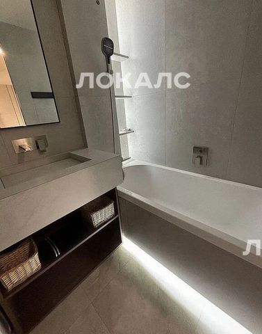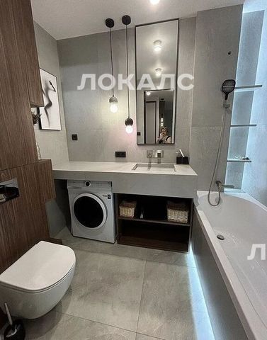 В ванной комнате: роскошная ванна, включая душ и настройки направления воды на лейке, широкая раковина ,переходящая в столешницу выполнена из плитки по индивилуальному проекту. Большое зеркало под потолок, стиральная машина. Подсветка полок и ванной создает атмосферное настроение.