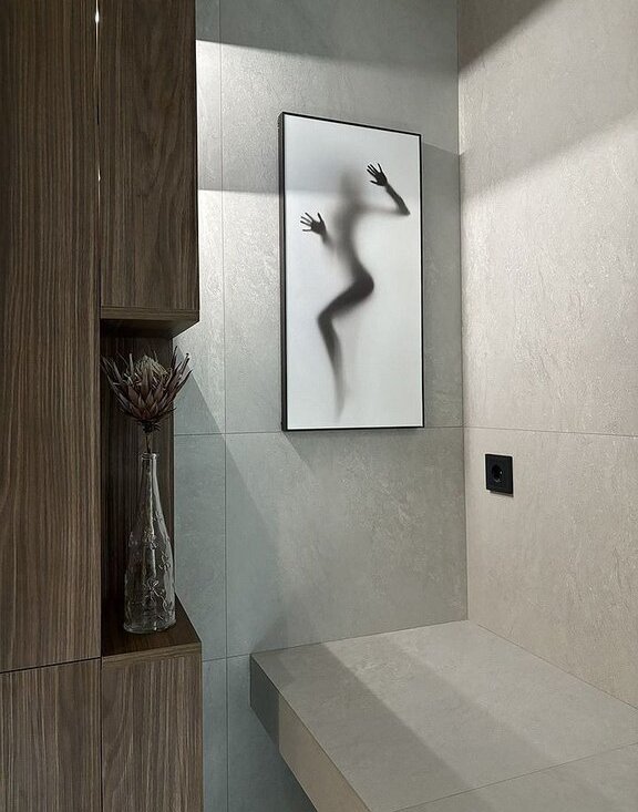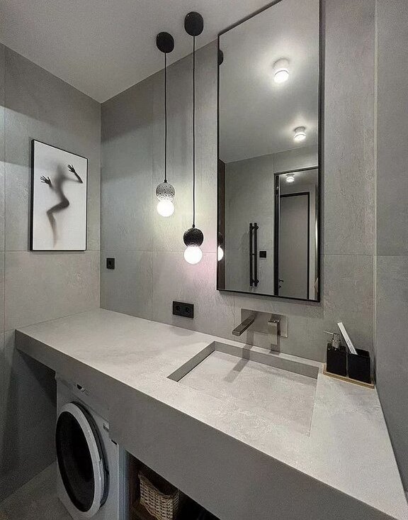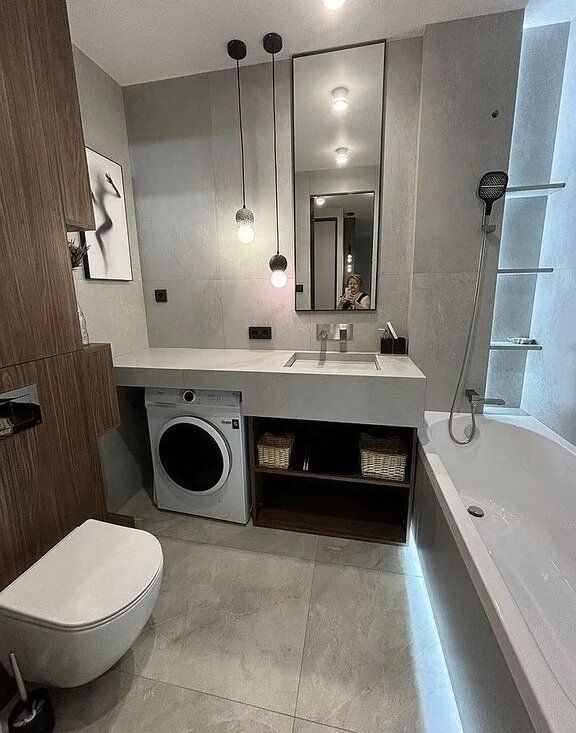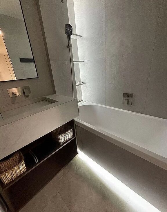 В ванной комнате: роскошная ванна, включая душ и настройки направления воды на лейке, широкая раковина ,переходящая в столешницу выполнена из плитки по индивилуальному проекту. Большое зеркало под потолок, стиральная машина. Подсветка полок и ванной создает атмосферное настроение.