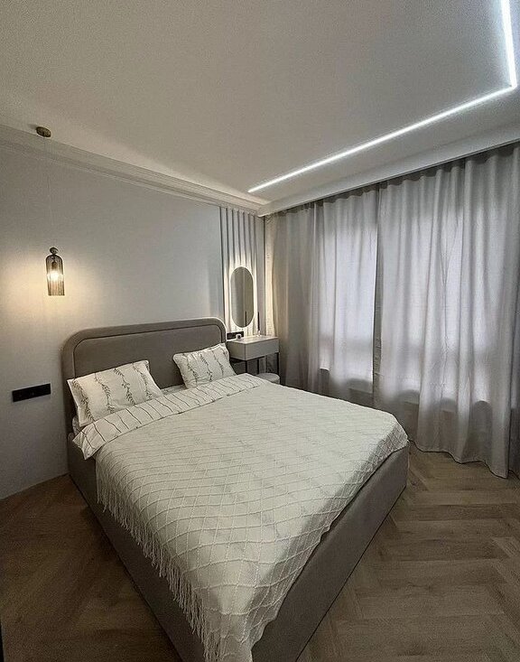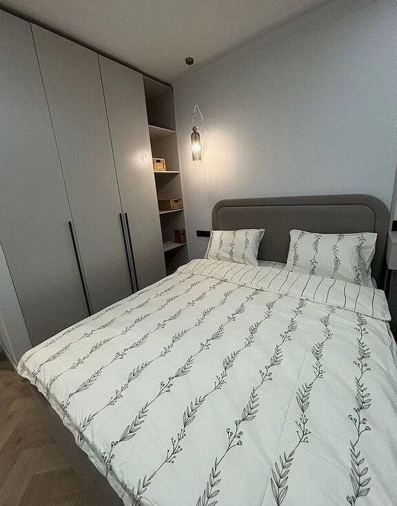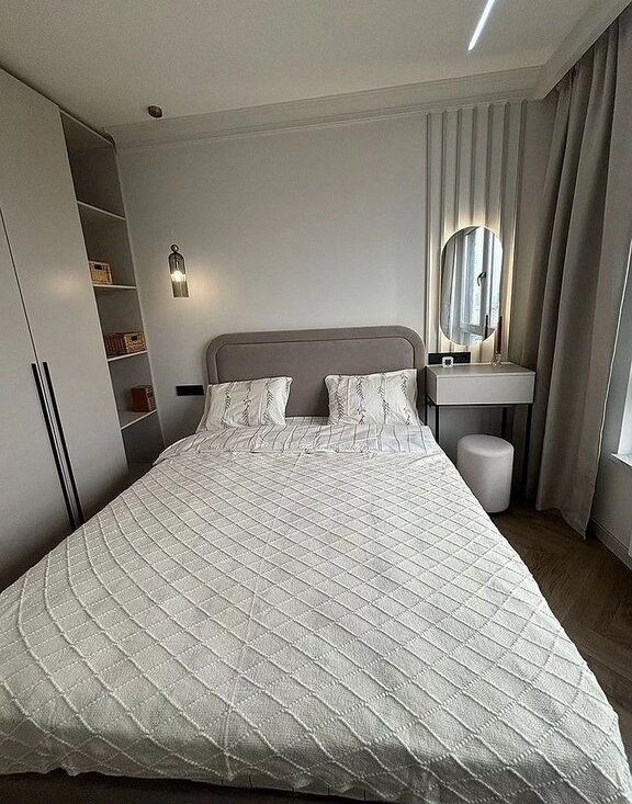 В спальне имеется кровать с подъемным механизмом и удобным ортопедическим матрасом ,стильный дамский столик с парящим зеркалом. Большой вместительный шкаф с полками.