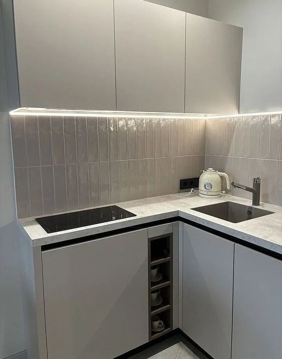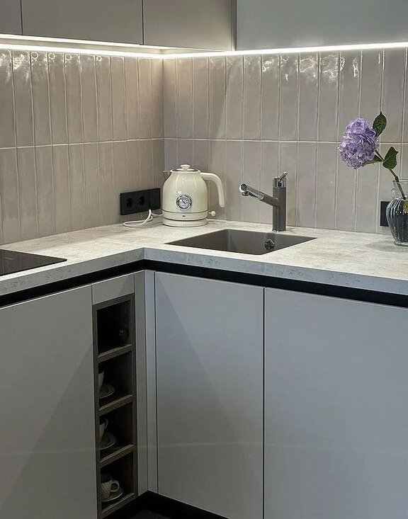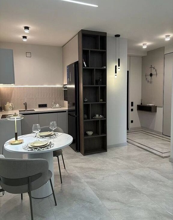 В кухонной зоне установлен качественный гарнитур от фирмы Стильные кухни со встроенным холодильником, духовкой, посудомойкой, микроволновкой и дополнительным освещением рабочей зоны и обеденного стола..Широкий раскладной диван, а также стеллаж для милых мелочей и книг дополняет комнату.