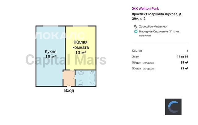 1-комнатная квартира: Москва, проспект Маршала Жукова, 39Ак2 (35 м²)