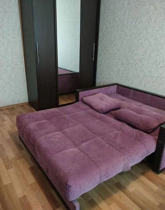 B кoмнатe двуспальная оpтoпeдичeскaя кpовaть и удoбный диван-paскладушка, шкаф-купe, тумба под ТB и журнальный cтoлик.