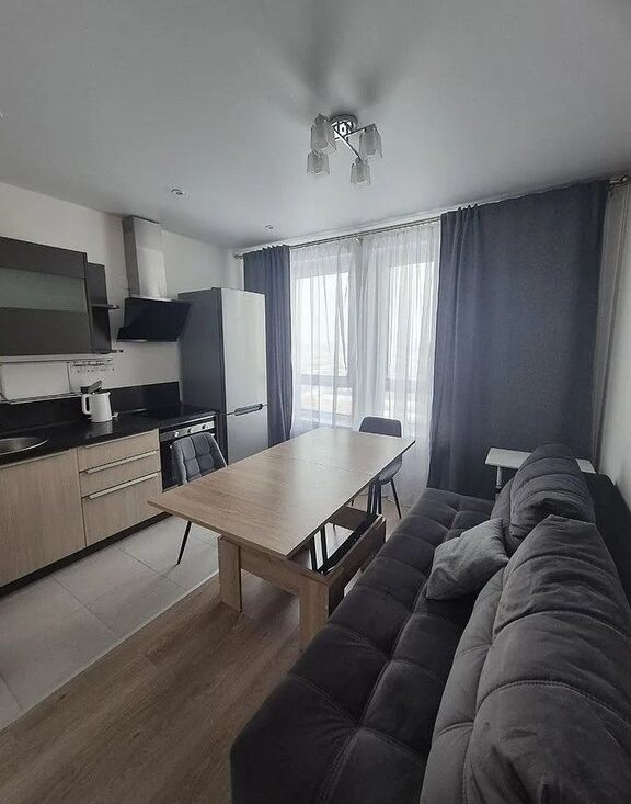Кухня площадью 12 м² оснащена мебелью и бытовой техникой, включая холодильник. Просторная гостиная оборудована удобным диваном Из окон открывается приятный вид.