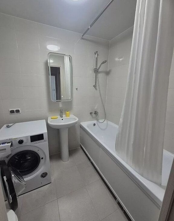 Ванная комната светлая и аккуратная, с современной сантехникой и стиральной машиной. В прихожей предусмотрены вместительные шкафы для хранения вещей.