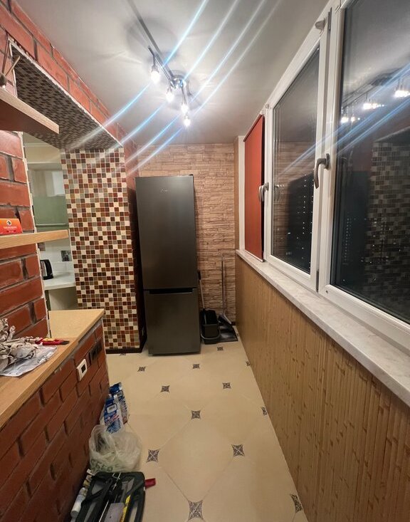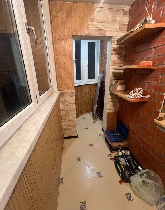 Большая застеклённая лоджия, окна выходят во двор.