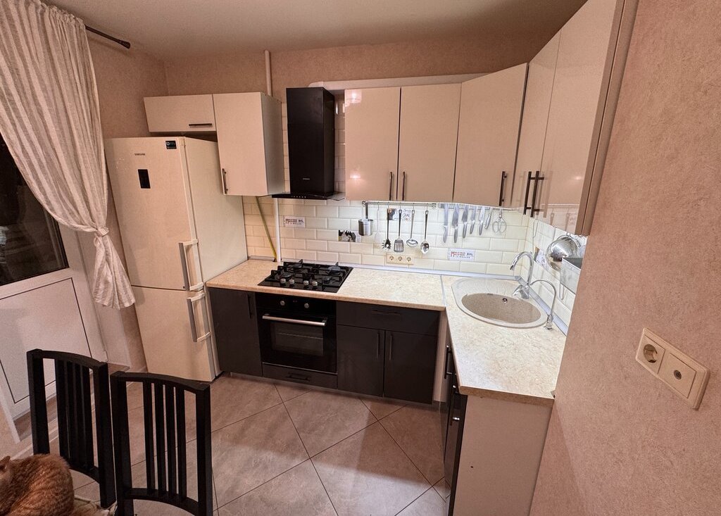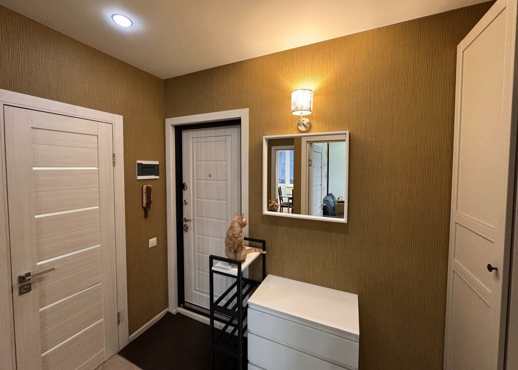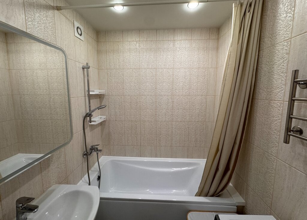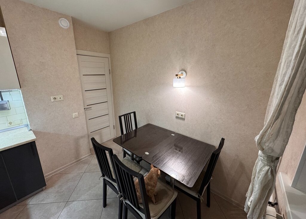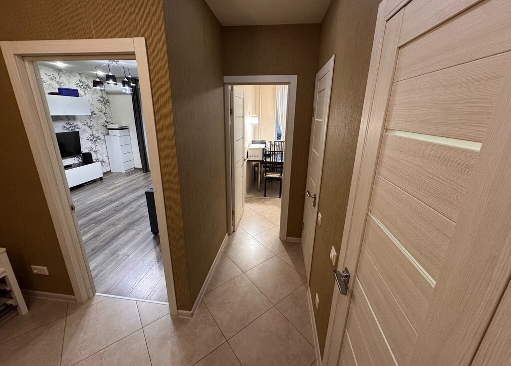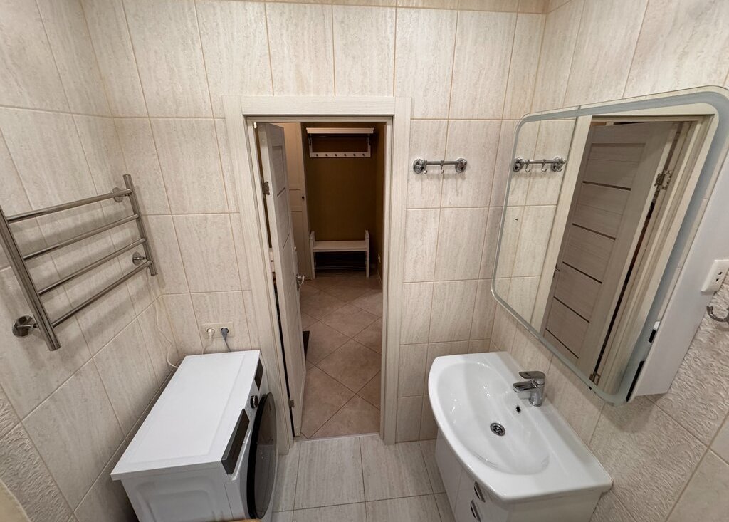 Евроремонт выполнен в светлых тонах с использованием качественных материалов: на полу ламинат, стены оклеены виниловыми обоями, потолки — натяжные тканевые с подсветкой. Квартира полностью оснащена необходимой мебелью и техникой, которая остается новым владельцам: кухонный гарнитур, плита, холодильник, электрический духовой шкаф, кухонная вытяжка, вытяжные вентиляторы в санузлах, стиральная машина, шкафы и другая мебель в прихожей и комнате, телевизор, сплит-система.
