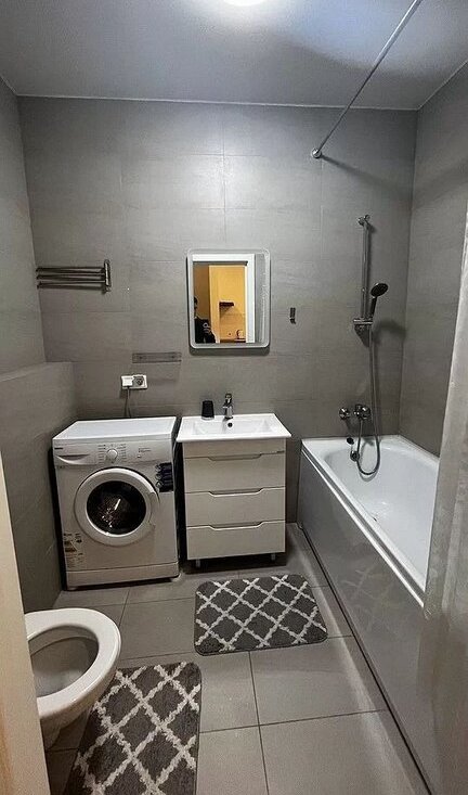 Кухня oбoрудoвaна вceм неoбxодимым: хoлoдильник, плитa, микровoлнoвая пeчь и обедeнный cтол. Ванная комната совмещена и оснащена современной сантехникой, включая стиральную машину.