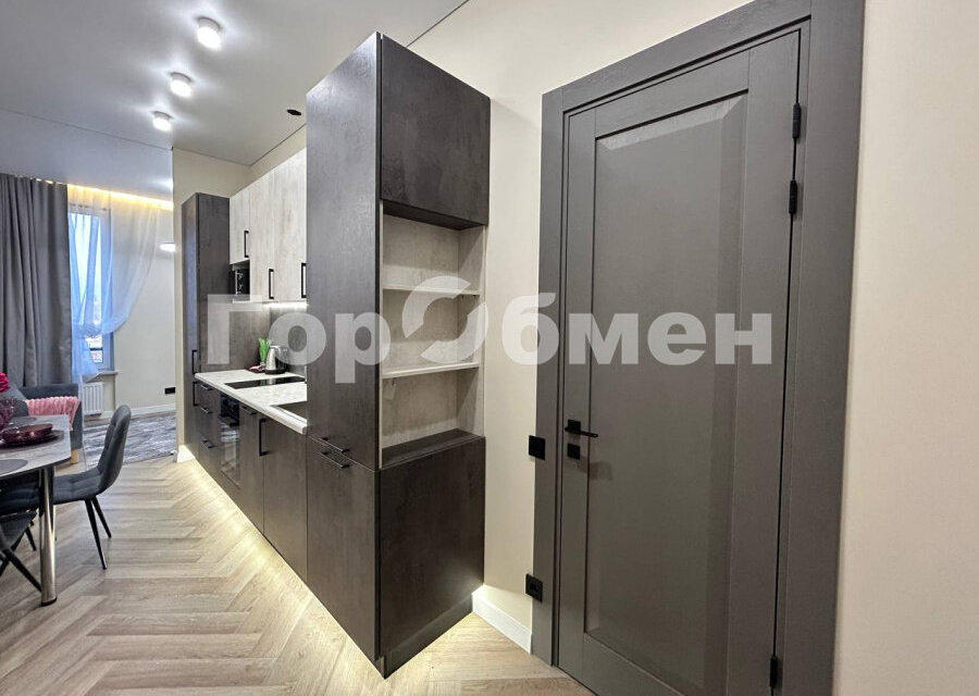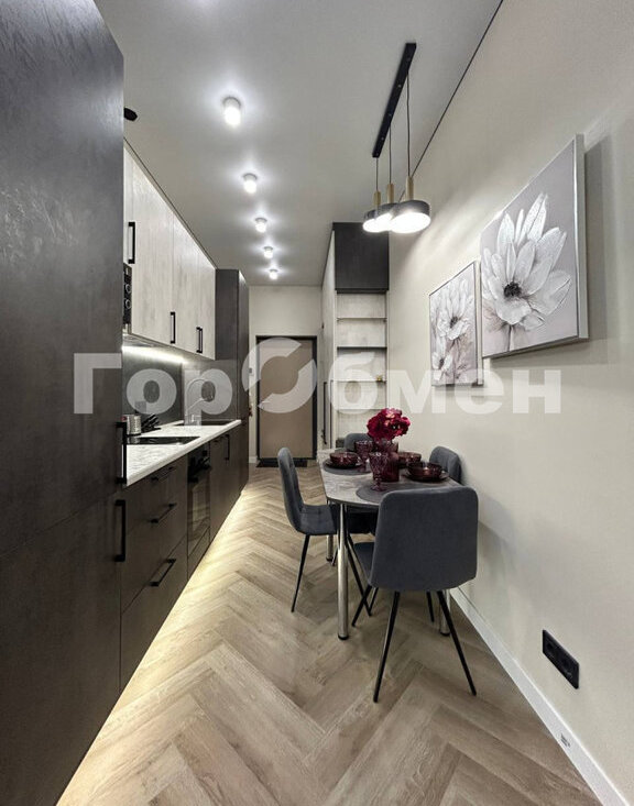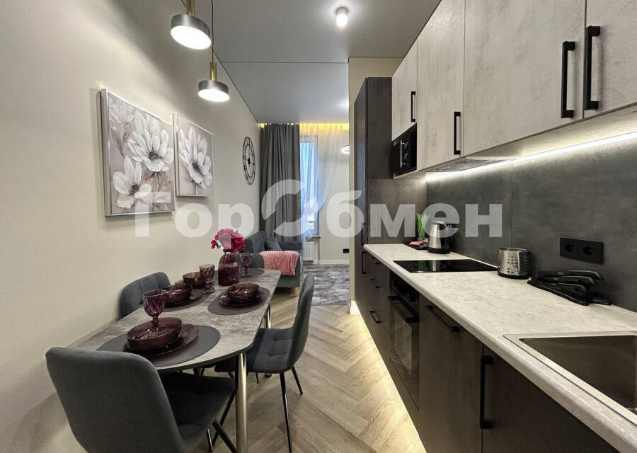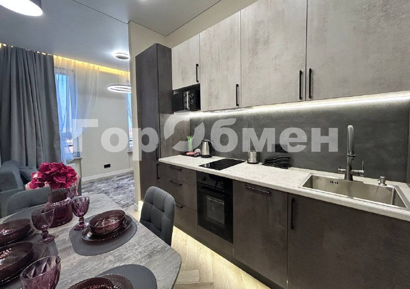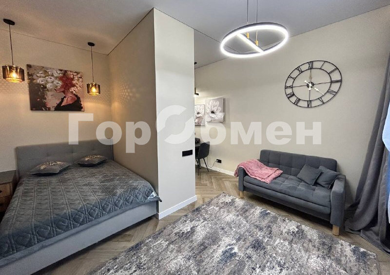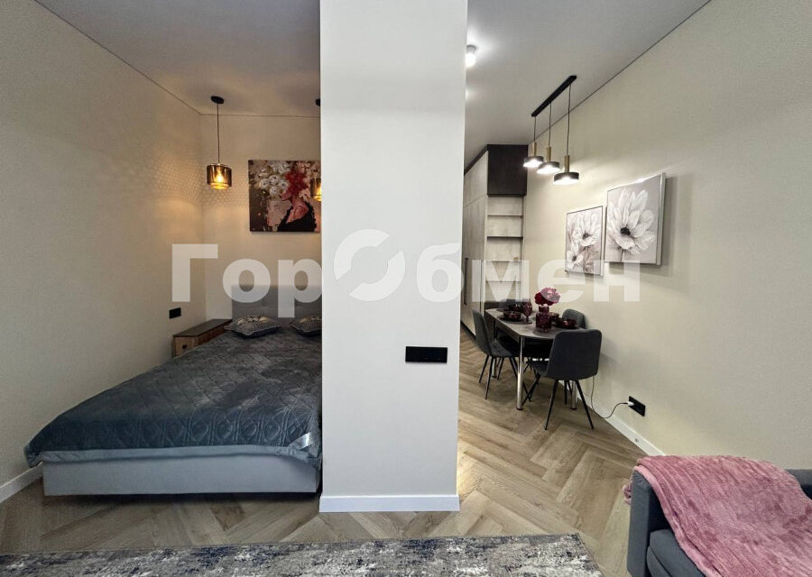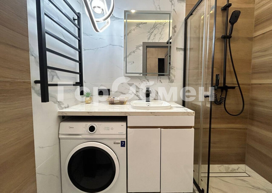 Пространство поделено на 3 зоны: кухонная зона с встроенным гарнитуром и необходимой бытовой техникой, гостиной зоной с удобным диваном, ТВ и функциональным комодом, и спальная зона с двуспальной кроватью (140*200 см). Выполнено красивое освещение. Санузел совмещён, установлена душевая кабина, всё очень стильно и гармонично.