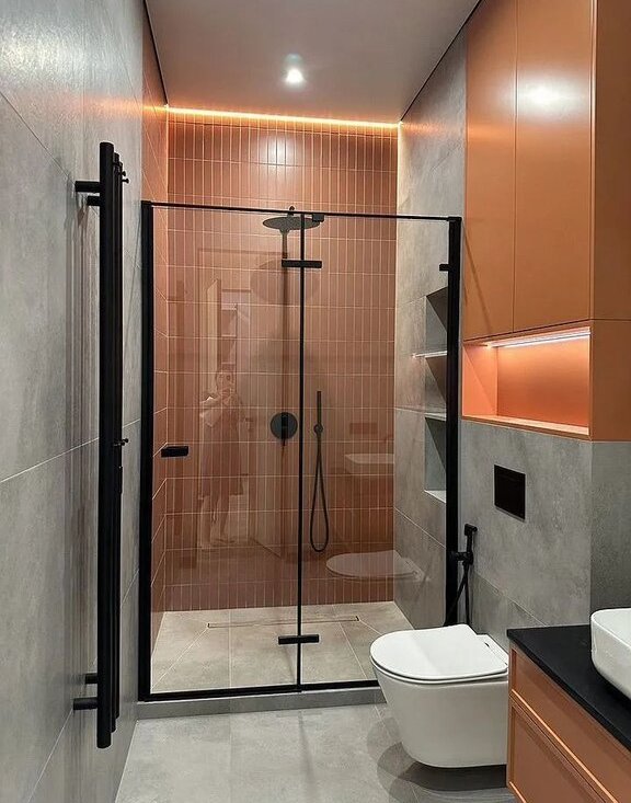 Совмещенный санузел выполнен в современном стиле с душевой кабиной и стильной сантехникой.