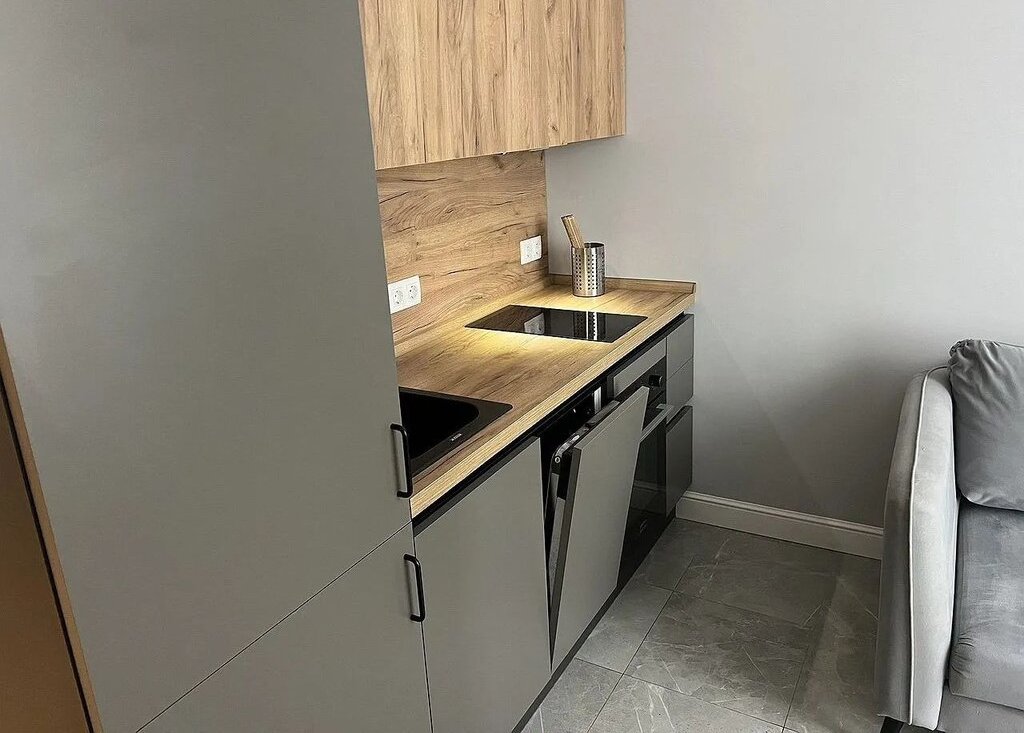 Кухня площадью 13 м² оборудована современной техникой, включая стиральную машину. Ванная комната совмещенная, оформлена стильными материалами.