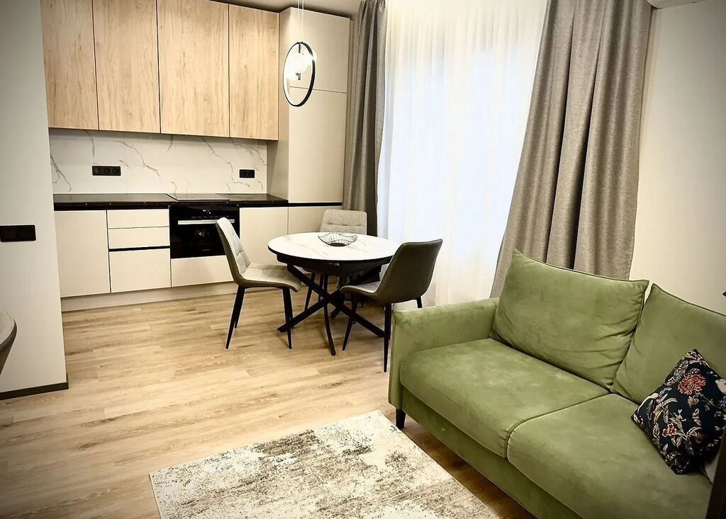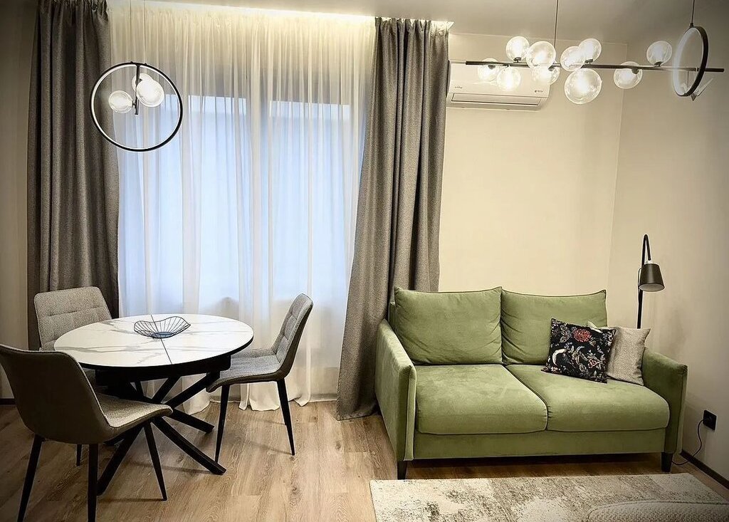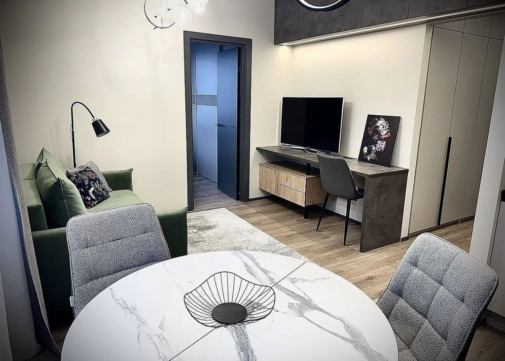 Квартира с красивым видом из окна, абсолютно новая, в ней все продумано для комфортного проживания. Планировка функциональная, выделены зоны: кухни, гостиной и прихожей. Спальня изолированная.