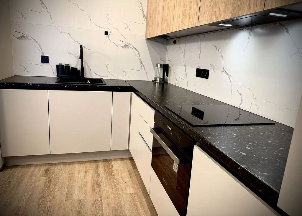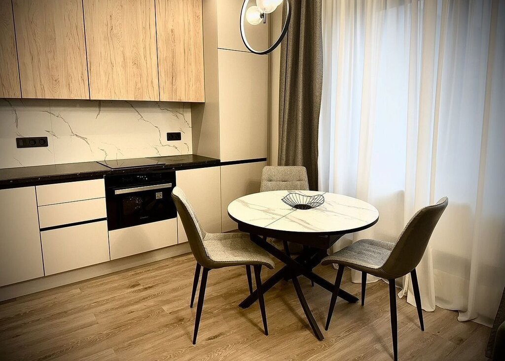 Кухня оснащена всем необходимым: большим холодильником Gоrеnjе с морозильной камерой, посудомоечной машиной, индукционной варочной панелью, духовым шкафом с функцией СВЧ, вытяжкой, чайником, кондиционером, новой посудой и столовыми приборами, бокалами и прочим. Обеденный стол раздвигается.