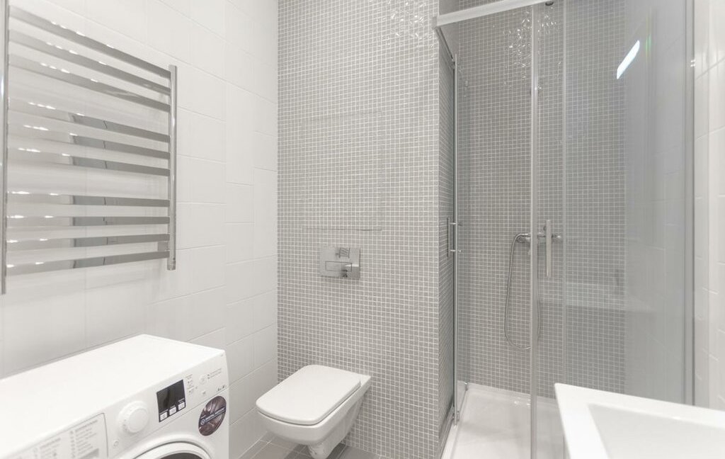 В совмещенном санузле есть душевая кабина и стиральная машина.