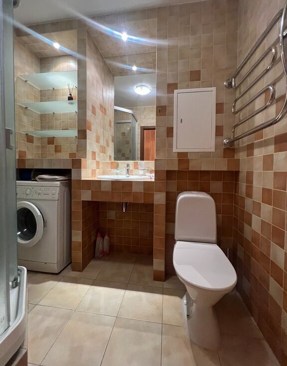 С/у совмещен, просторный. Установлена душевая кабина, стиральная машина.